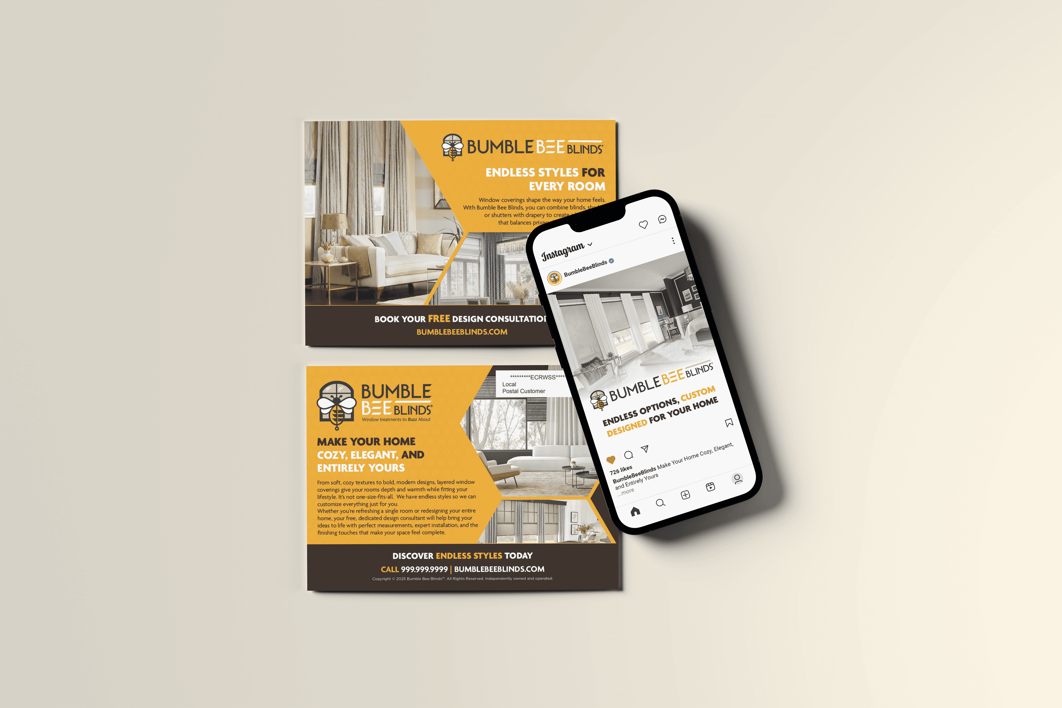 This campaign highlights how combining blinds, shades, shutters, and drapery can transform any room into a more personal, warm, and functional space. The visual approach focuses on layering: stacked textures, overlapping shapes, and staged interiors that communicate comfort, versatility, and customized design solutions. By presenting multiple window-treatment combinations the campaign reframes the brand’s offering from “one product” to a complete styling experience, helping customers understand how layered treatments elevate both aesthetics and everyday living. Bumble bee's warm color palette, clean hierarchy, and aspirational photography reinforce the idea that every home can feel more elegant, cozy, and tailored to its owner—while keeping the messaging accessible, inviting, and conversion-ready across formats.